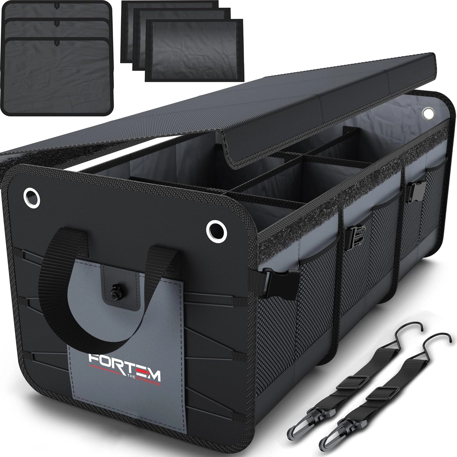 Keep your cargo area neat and tidy with this Heavy-Duty Trunk Organizer. Featuring three adjustable compartments, side mesh pockets, and reinforced handles, it’s perfect for storing groceries, tools, emergency kits, and more.